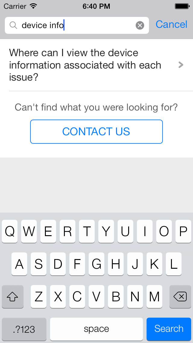 You can use the showFAQs api call to provide a way for the user to invoke the purpose built help/support section in your app. This is the easiest approach to enable help in your app as it bundles all the capabilities of the Helpshift SDK in a simple and intuitive interface. You can wire this api call to a "Help" or "Support" action in your app. This Activity combines the FAQ, Search and Contact Us functionality together in a single interface. In this view a user has to search for a specific question in the FAQ failing which they can report an issue. When you respond back to their question from the Helpshift Agent Dashboard, the reply will be shown as a count besides Contact Us, clicking on which will open up the conversation.
